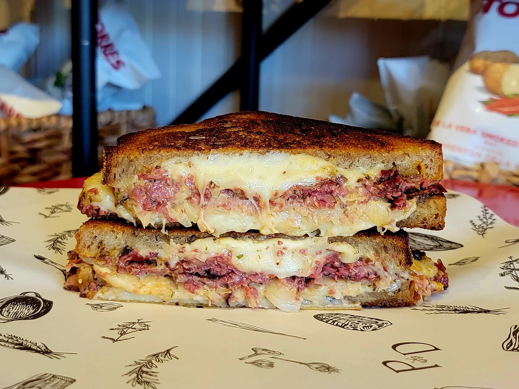 peasants pastrami (house brined, smoked and steamed, peppercorn and coriander crusted beef brisket), sauerkraut, Emmental cheese, secret sauce, Bob’s corn rye bread